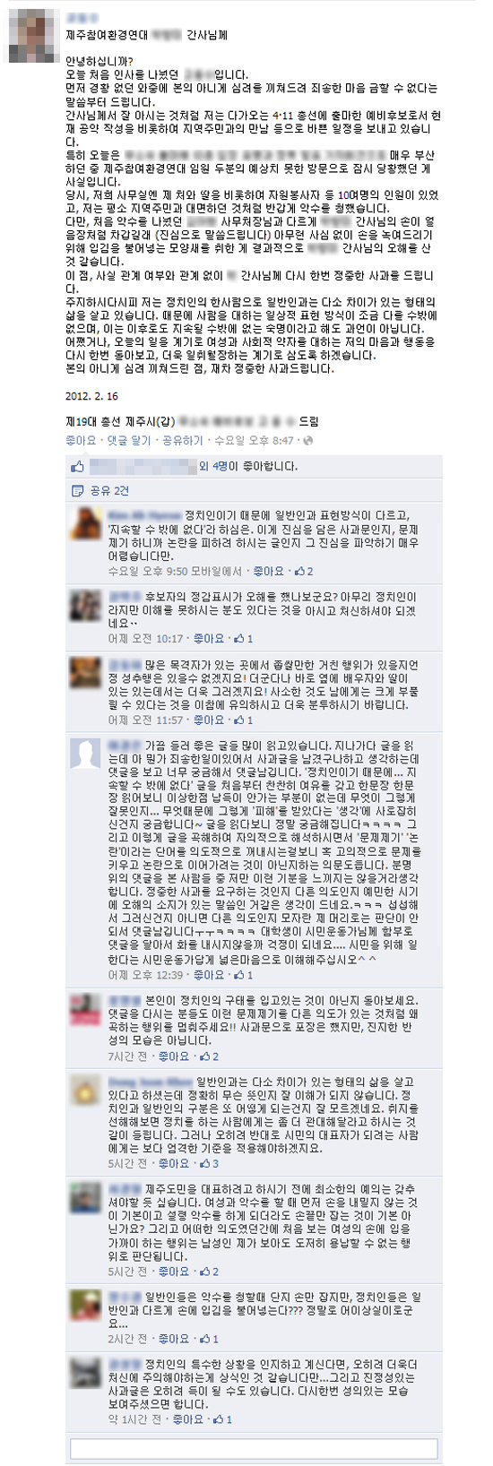 4·11총선 예비후보 성추행 논란과 관련 해당 예비후보가 페이스북에 사과의 뜻을 밝히는 글을 올리자 당사자를 비난하는 글이 올라오고 있다.