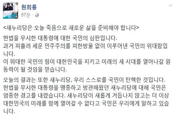 원 지사는 “오늘의 결과는 또한 새누리당, 우리 스스로를 국민이 탄핵한 것”이라며 “헌법을 무시한 대통령을 맹종하고 방관해왔던 새누리당에 대해 국민은 엄중한 경고를 내렸다”고 말했다.