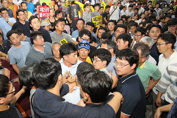 ![18일 오후 제주 서귀포시 강정동 김정문화회관에서 열린 제주 제2공항 추진상황 설명회가 반대측 주민들의 거샌 항의로 이뤄지지 못하고 있다. [뉴시스]](/data/photos/201709/33705_44966_1127.jpg)