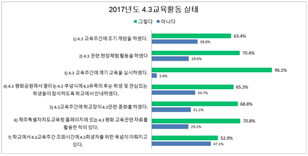지난해 학교에서 이뤄진 4·3교육활동 실태를 묻는 질문에서는 조사에 응한 교사의 96.1%가 “4·3교육주간에 계기교육이 이뤄졌다”고 답했다. 70.4%는 “4·3관련 현장체험 활동을 했다”고 답했다. 또 70.8%가 “제주도교육청 홈페이지에 있는 4·3평화 교육관련 자료를 활용했다”고 답했다.