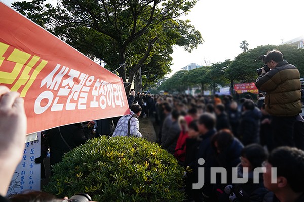 집회 측은 “제주는 지금 거대한 학살 앞에 서 있다”며 “민주주의와 평화가, 공명정대한 절차가, 뭇 생명이, 미래가 학살되고 있다”고 강조했다.