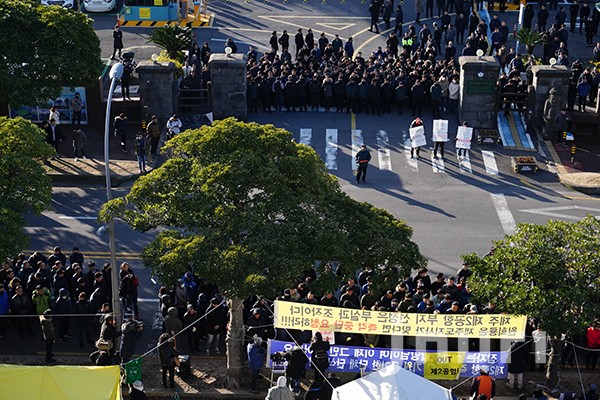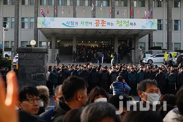 이날 오전 9시가 조금 넘은 시간부터는 제주시청 공무원 250여명이 천막을 에워싸기 시작했다. 도청 소속 공무원들도 도청 입구를 막아섰다. 공무원들은 모두 300여명이 넘게 동원됐다.