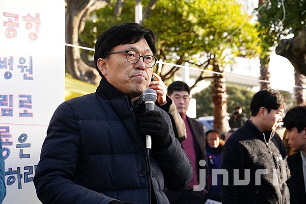 ![제주도와 제주시가 7일 오전 9시부터 제주도청 앞에 설치된 천막에 대해 행정대집행에 들어갈 것을 예고하자 제주녹색당과 제2공항 반대측은 이에 반발, 이날 오전 8시30분부터 행정대집행을 막기 위한 집회에 들어갔다. 하승수 제주녹색당 공동집행위원장이 발언을 하고 있다. [제이누리=고원상 기자]](/data/photos/201901/39098_53073_3321.jpg)
