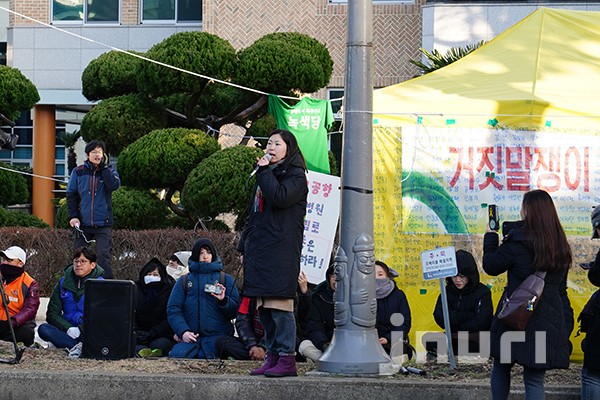 ![제주도와 제주시가 7일 오전 9시부터 제주도청 앞에 설치된 천막에 대해 행정대집행에 들어갈 것을 예고하자 제주녹색당과 제2공항 반대측은 이에 반발, 이날 오전 8시30분부터 행정대집행을 막기 위한 집회에 들어갔다. 고은영 제주녹색당 공동집행위원장이 발언을 하고 있다. [제이누리=고원상 기자]](/data/photos/201901/39098_53075_3356.jpg)