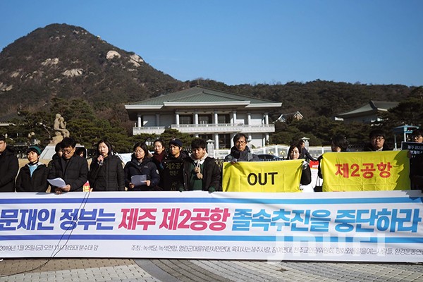 제주녹색당과 환경운동연합, 참여연대, 천주교인권위원회 등 8개 단체는 25일 오전 청와대 앞에서 기자회견을 갖고 “제주 제2공항은 수요 과다예측으로 환경을 파괴하고 지역갈등을 조장하는 사업”이라며 청와대에 이를 즉시 중단시켜줄 것을 요구했다.