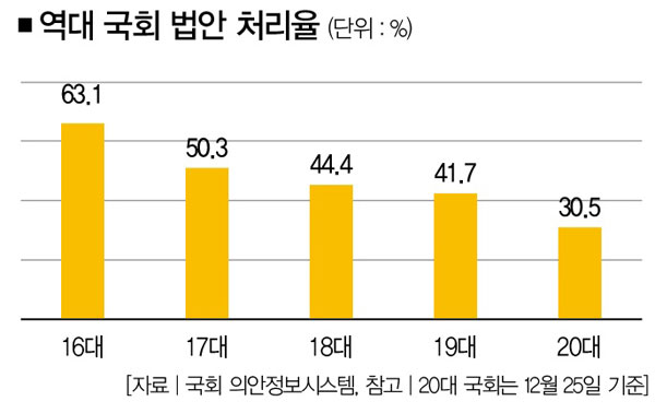 국회 의안정보시스템에 따르면 12월 25일 기준 20대 국회에 접수된 법안은 총 2만3579건. 그러나 이날까지 본회의에서 처리된 법안은 7211건, 법안 처리율은 30.5%에 그쳤다. 계류 법안 1만6368건은 20대 국회가 끝나면 자동폐기 수순을 밟는다. 여야가 내년 1~2월에라도 임시국회를 열어 법안을 처리할 수 있다.