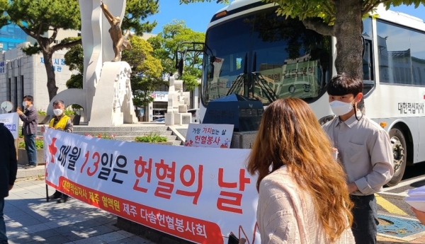 제주도혈액원은 이에 따라 13일 제주시청 인근에서 이러한 상황을 알리며 도민들의 헌혈참여를 호소하는 캠페인을 열었다.