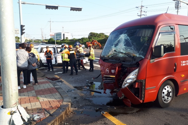 31일 제주소방서에 따르면 전날 오후 6시 1분께 제주시 한림읍 동명사거리에서 좌회전하던 카니발 렌터카와 맞은편에서 직진하던 콤비버스가 부딪혔다.