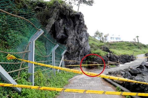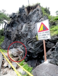 제주 서부 지역 관광명소인 애월읍 한담해변 산책로에 바위가 떨어졌다. 산책객들의 각별한 주의가 요구된다.