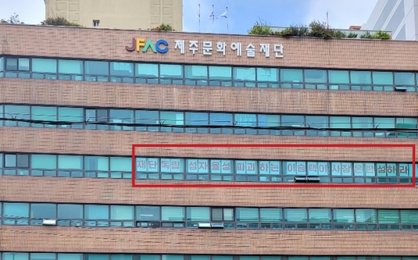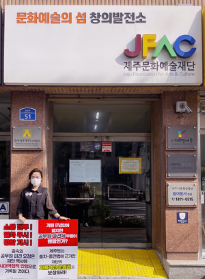 제주문예재단 노조는 파견 요청 철회 시까지 오전 8~9시 출근 시간에 재단 건물 앞에서 1인 시위를 벌일 예정이다. 현재 재단 건물 외벽에는 파견 요청 철회 등을 촉구하는 문구가 붙어있다.