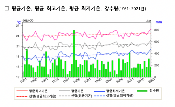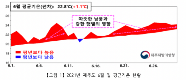 제주지방기상청이 6일 발표한 ‘2021년 제주도 6월 기상 특성’에 따르면 지난달 제주의 평균기온은 평년(21.7도)보다 1.1도 높은 22.8도다.