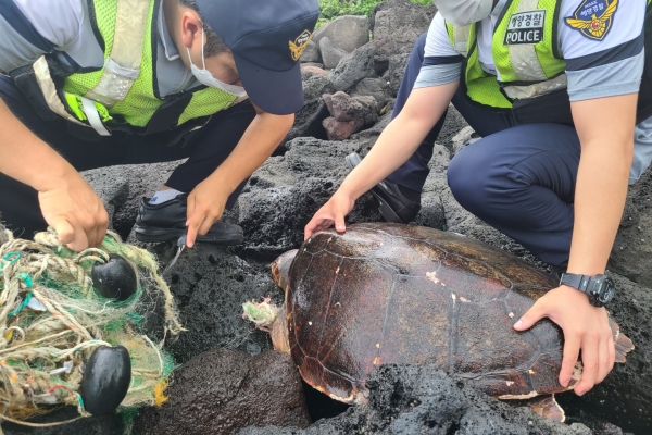 12일 제주해양경찰서에 따르면 11일 오전 10시 25분께 제주시 애월읍 한담해변 인근 해안을 순찰하던 한림파출소 순찰팀이 폐그물에 걸려 움직이지 못하고 있는 거북을 발견했다.