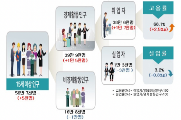 경제활동인구는 지난달 39만9000명으로 전년동월대비 1만5000명(3.8%p) 증가했다. 비경제활동인구는 16만8000명이다. 지난해 같은 기간과 비교해 1만명(5.7%p) 줄었다.