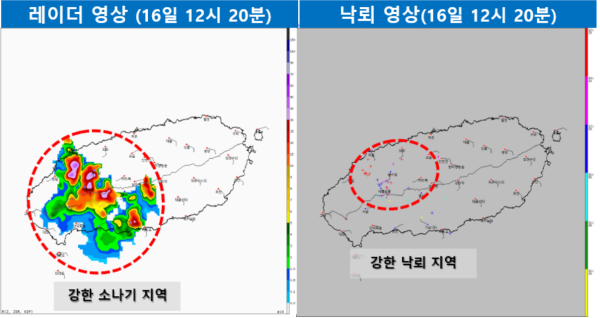 16일 제주 곳곳에 천둥·번개를 동반한 강한 소나기가 쏟아지고 있다.