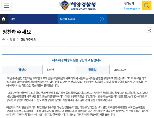 이 경장은 "당연히 해야 할 일을 한 것뿐이고, 비슷한 일이 생겨도 주저 없이 똑같이 할 것"이라며 "이안류 등으로 인해 해상에서 사고가 발생하면 바로 해경에 신고해달라"고 당부했다. [제이누리=박지희 기자]