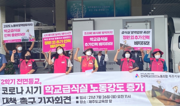 전국학교비정규직노동조합 제주지부는 26일 오전 제주도교육청 앞에서 기자회견을 열고 “급식실 조리.배식 인력을 충원하라"면서 "또 급식실을 대상으로 방역.소독.청소업무를 명확히 해 방역지원 인력을 투입하라”고 촉구했다.