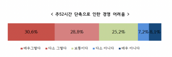 주 52시간 근무제가 기업에 미치는 어려움 정도를 묻는 설문결과 “매우 그렇다(30.6%)”, “다소 그렇다(28.8%)” 등 59.4%가 근로시간단축으로 인해 경영에 어려움을 겪고 있는 것으로 나타났다.