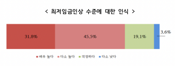 내년 최저임금 인상 수준을 묻는 질문에 “다소 높다(45.5%)” , “매우 높다(31.8%)”가 1.2위를 차지하는 등 ‘높다’는 비율이 전체의 77.3%를 차지했다.