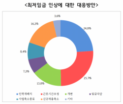 최저임금 인상에 따른 대응방안에 대해선 '주 52시간제와 연계한 근로시간 조정(25.7%)'과 '인력재배치 등 고용인원 조정 (24.0%)'을 가장 많이 꼽았다.