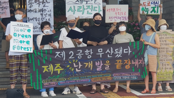 강정천을 지키는 사람들, 비자림로를 지키기 위해 뭐라도 하려는 시민모임, 선흘2리 동물테마파크 반대대책위원회 등 6개 단체는 2일 제주도청 앞에서 기자회견을 열어 "제2공항이 무산됐다. 이제 남은 난개발 사업도 끝장내자"고 촉구했다.