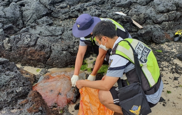 해경은 해수욕장 이용객들의 안전을 위해 수거용 포대 자루에 담아 육상으로 이동 조치했다.