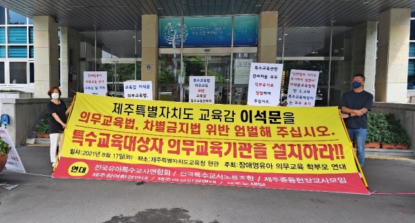이들 단체는 “이석문 교육감도 도내 만 3세 특수교육대상자를 입학시키는 데 필요한 특수교육기관(유치원 특수학급, 특수유치원) 설치·운영 의무를 다하지 않아 의무교육 권리를 침해하고 있다”면서 엄벌을 촉구했다.