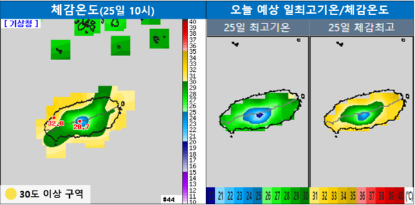 체감온도는 한림 32.4도, 성산 31.7도 등 대부분의 지역이 30도를 웃돌고 있다.