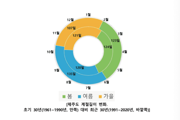 제주지방기상청은 ‘제주 24절기 계절길이 변화 분석 자료집’을 13일 발간, 최근 60년 중 초기 30년(1961∼1990)과 최근 30년(1991∼2020)을 비교 분석했다.