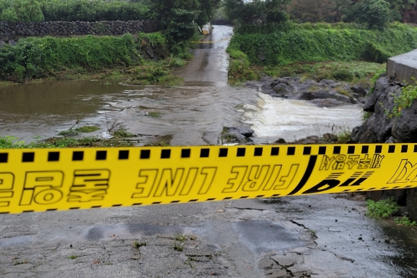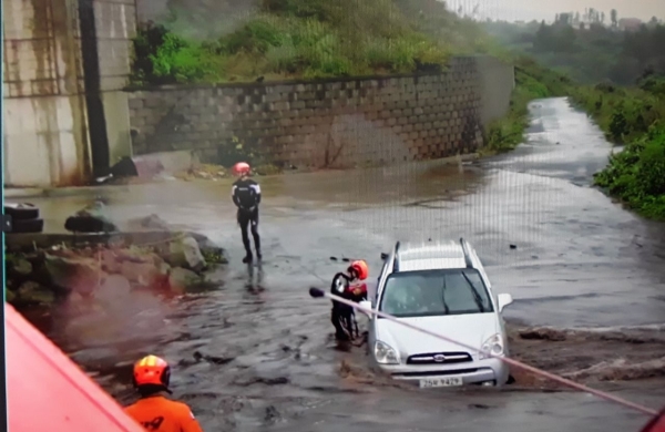 이날 오전 9시 45분께 많은 비로 제주시 용강동 대룡소천 인근 도로가 물바다로 변하면서 이 도로를 지나던 차량이 고립됐다. 이보다 앞선 오전 8시 58분께 서귀포시 서호동 수모루사거리도 침수돼 차량 1대가 고립되면서 안전조치가 이뤄졌다.