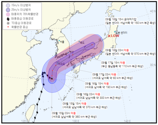 기상청은 “16일과 17일 사이 제주와 남부지방은 태풍의 직접 영향을 받겠다”면서 “이때까지 제주에 강풍을 동반한 강하고 많은 비가 계속 쏟아질 것으로 예상된다. 관련 피해가 없도록 대비해 달라”고 당부했다.