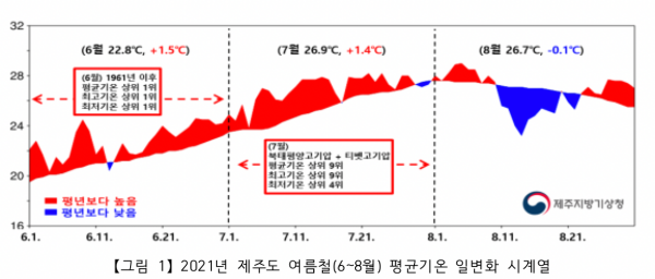 15일 제주지방기상청이 발표한 2021년 제주도 여름철(6∼8월) 기상 특성에 따르면 올여름 제주 평균기온은 25.5도로 나타났다. 평년(24.5도)보다 1도 높았다.