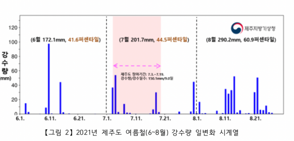 장마철 강수량은 150.1㎜로 평년(348.7㎜)보다 적었다. 강수일수도 평년(17.5일)보다 적은 9일이었다.