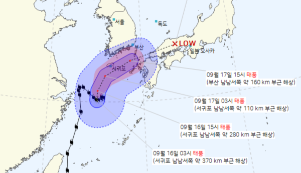 태풍의 영향으로 제주에 이날 오후부터 17일 오전 사이 시간당 50∼80㎜ 이상의 매우 강한 비가 내리는 곳이 있겠다.