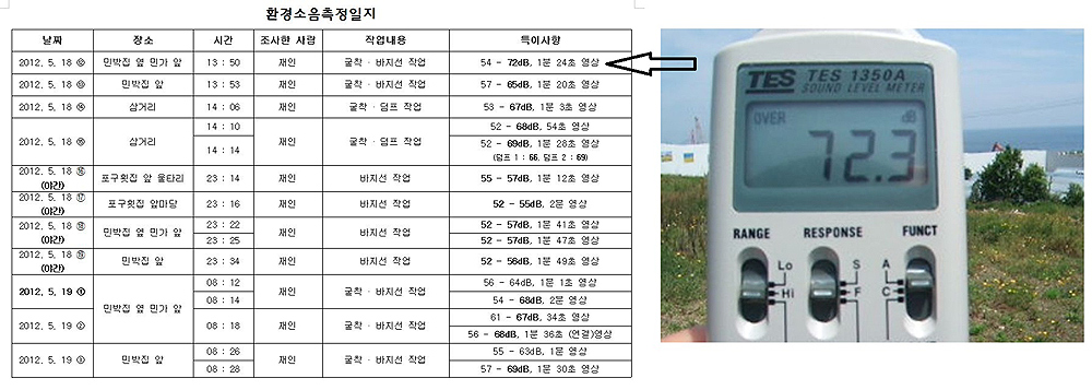 마을회는 “감시단이 하루 4회 소음측정기를 이용해 공사장 인근에서 측정한 결과, 소음진동규제법에서 규정한 기준과 해군본부의 환경영향평가서에서 제시한 기준을 80번 이상 넘긴 것으로 파악됐다”고 지적했다.