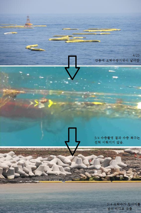 또한 “해상의 경우 오탁수가 다량으로 유입돼 위반했다”며 “시공업체는 오탁수방지막 플루팅만 설치하고 수중 복구는 이뤄지지 않았다”고 사진과 함께 증거자료를 제시했다.