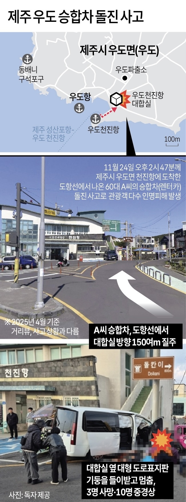 전날인 24일 오후 2시 47분께 제주시 우도면 천진항에 도착한 도항선에서 내린 관광객 A(62)씨가 몰던 스타리아 렌터카가 갑자기 '부웅' 하고 급가속해 약 150m를 질주하며 사고를 냈다.