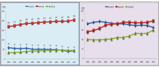 연령별로 보면 40~49세는 2000년부터 계속 경제활동참가율이 가장 높게 나타났다. 40~49세는 11년동안 경제활동참가율이 가장 크게 증가(3.0%p)했고 20~29세는 가장 크게 감소(-6.1%p)했다.