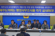 ▲ 제주시민사회단체연대회의가 4일 오전 제주도의회 도민의방에서 기자회견을 열고 오라관광지구개발사업 관련 위법 특혜 의혹에 대해 제주도의회의 적극적인 행정사무감사를 촉구했다. 제주도의회의 동의 절차를 앞둔 제주 오라관광지구에 대해 제주 시민단체들의 반발이 점차 거세지고 있다. 시민단체들은 동의안 부결을 촉구한데 이어 "제주도의회는 오라관광지구 개발사업 승인 과정의 위법·탈법 및 특혜 행정에 대한 행정사무조사를 하라"고 말했다. 제주도내 17개 시민사회단체로 구성된 제주시민사회단체연대회의는 4일 오전 11시 제주도의회 도민의 방에서 기자회견을 갖고 “제주미래 비전에 역행하는 오라관광지구 승인절차를 중단하라”며 이 같이 주장했다. 앞서 제주경실련도 지난달 30일 기자회견을 갖고, ‘오라관광지구 개발사업 환경영향평가협의내용 동의안’에 대해 부결 처리할 것을 촉구한 바 있다. 오라관광지구 조성사업은 중국자본이 주도하는 JCC(주)가 제주시 오라2동 일대 357만5753㎡ 부지에 2021년 12월까지 사업비 6조2800억원을 투자하는 대형 프로젝트다. 투자금액은 국내 단일 개발사업으로는 역대 최