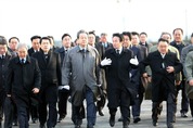 ▲ 김무성대표와 원희룡 지사가 4.3평화공원을 방문하고 있다. 제주 방문 이틀째인 김무성 새누리당 대표는 19일 제주 4·3평화공원을 방문, 박근혜 대통령의 4.3 국가추념일 행사 참석과 관련해 "다같이 갈등을 없애 대통령이 오도록 하자"고 밝혔다. 김 대표는 이날 오전 제주시 충혼묘지를 참배한 후 제주4.3평화공원을 방문했다. 김 대표는 제주시 봉개동 4·3평화공원 위령비를 참배한 뒤 방명록에 "상생과 화해의 정신으로 위대한 대한민국을 함께 만들어가자"고 적었다. 그는 정부의 4·3사건 희생자 재심의 추진 움직임에 대해 "상생과 화해의 정신으로 역사의 아픔을 다 보듬고 가야 한다"며 "제주도민들 정서에 맞는 좋은 결과가 나오리라고 생각한다"고 밝혔다. 김 대표는 '박근혜 대통령에게 오는 4·3 국가추념일 행사 참석을 적극적으로 건의하겠냐'는 질문에 "국가 추념일로 지정된 것은 아주 중요한, 잘 된 결정"이라며 "우리 다 같이 갈등을 없애 대통령이 오도록 해야 하지 않겠나"라고 말했다. 김 대표는 이날